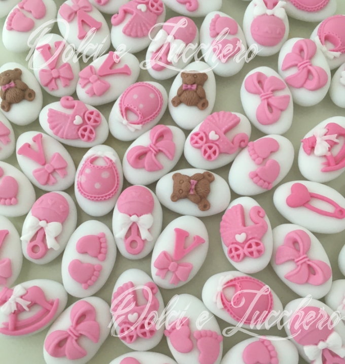 Set composto da 50 confetti classici al cioccolato decorati per la Nascita o il Battesimo di un bimbo o di una bimba